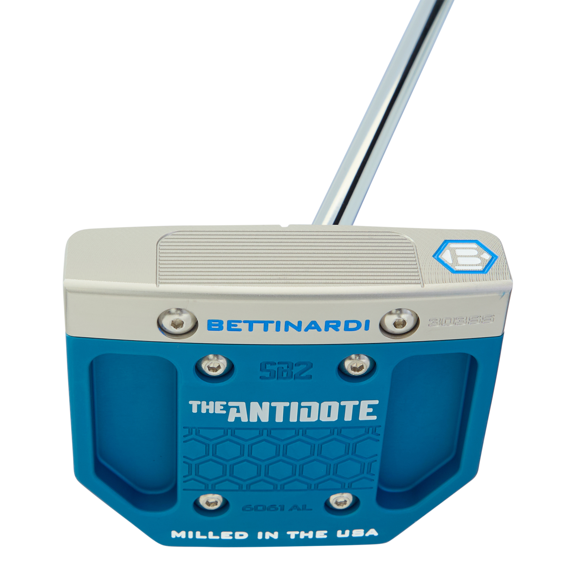 This limited edition Antidote SB2 features a Blue anodized body and a Diamond Blast anodized center insert. The putter comes paired with a chrome shaft, red Bettinardi Hex B standard grip, and matching white and red Antidote center-shafted mallet headcover.