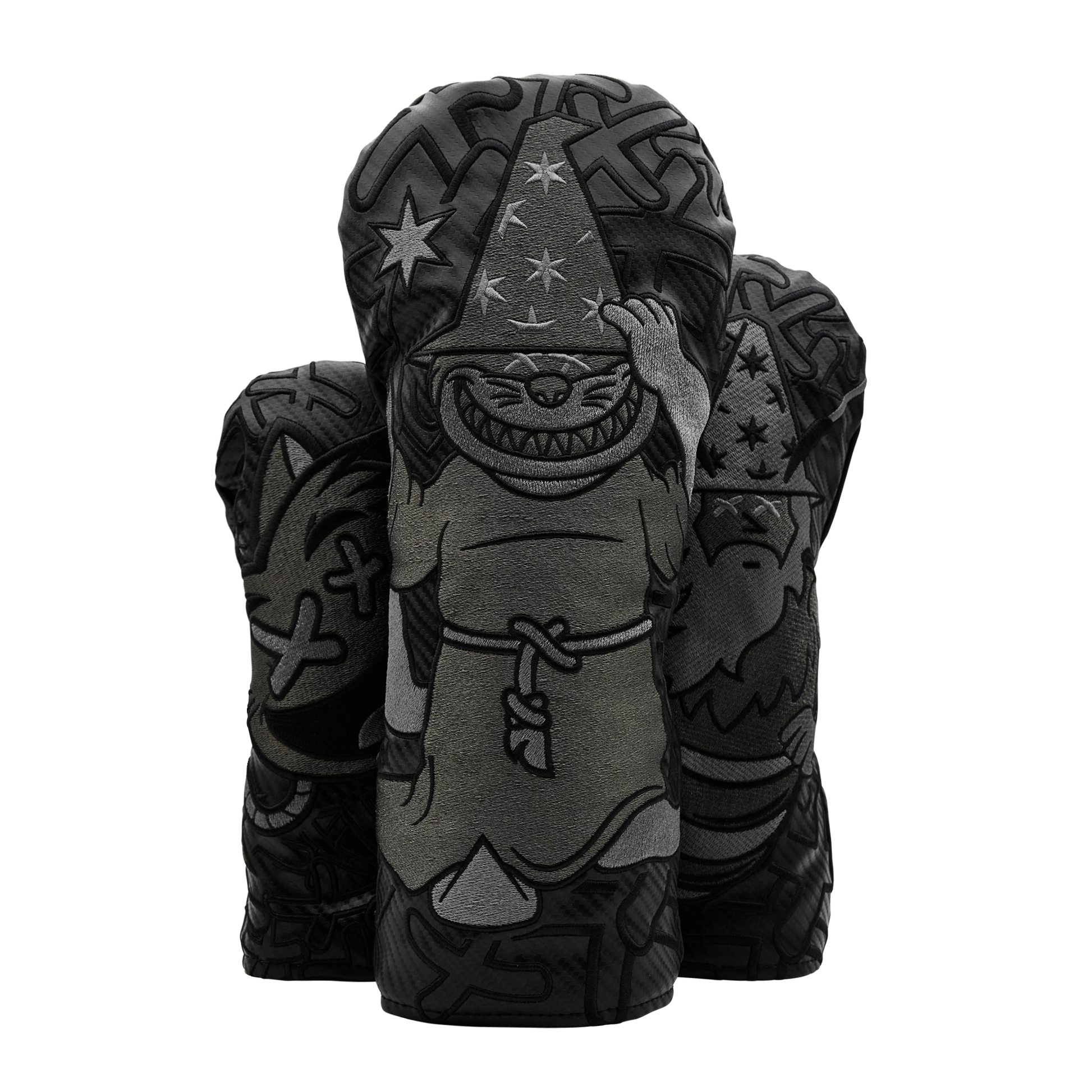 Designed for Black Friday, our Blackout Freaky Friday Icons wood set showcases our Grateful Poison Cat on the driver, Zombee Wiz on the 3 wood and a Poison Bomb Cat on the hybrid. Finished on a black pebble base and black plush interior to keep your clubs protected. Limited quantities are available. Limit 1 per person. Good luck!