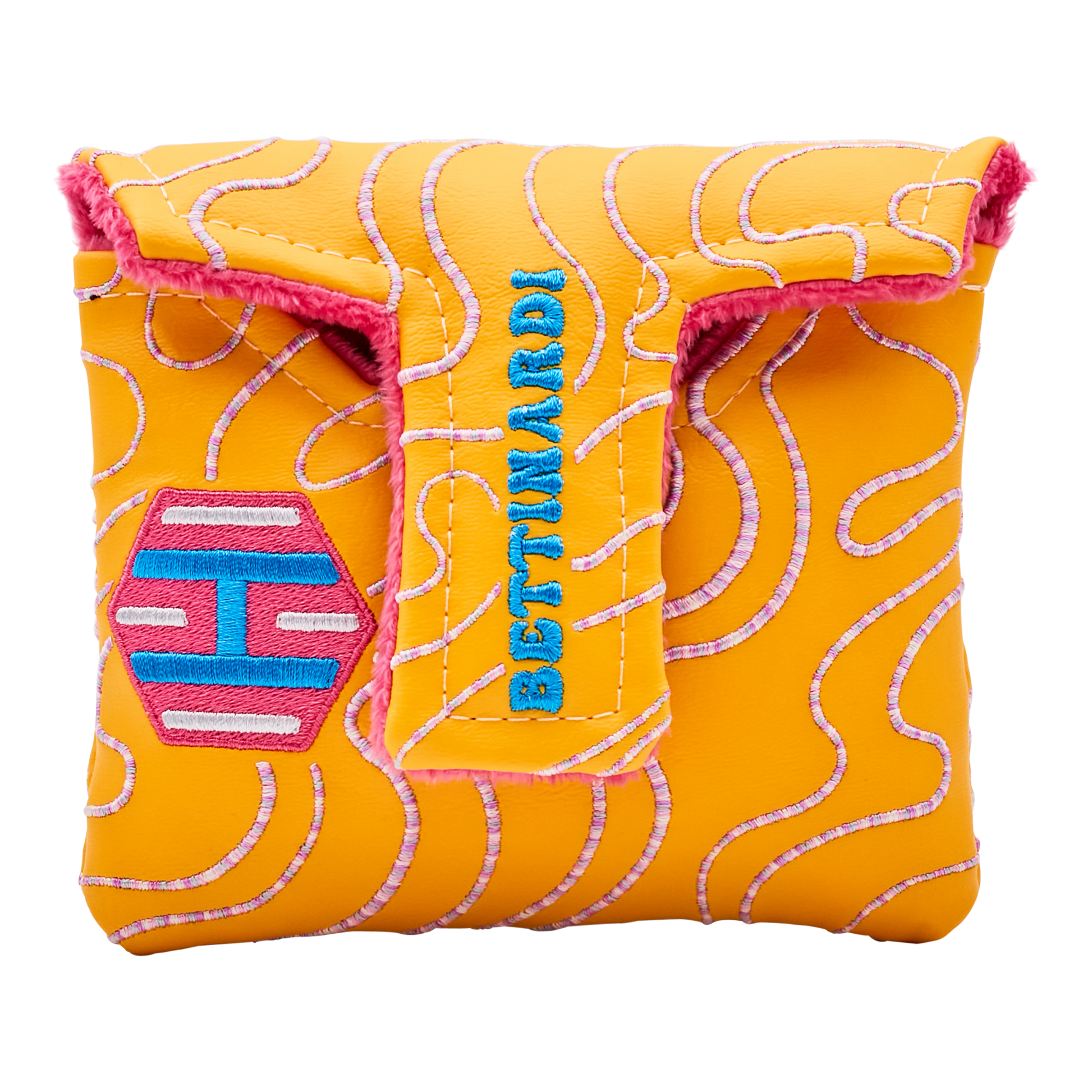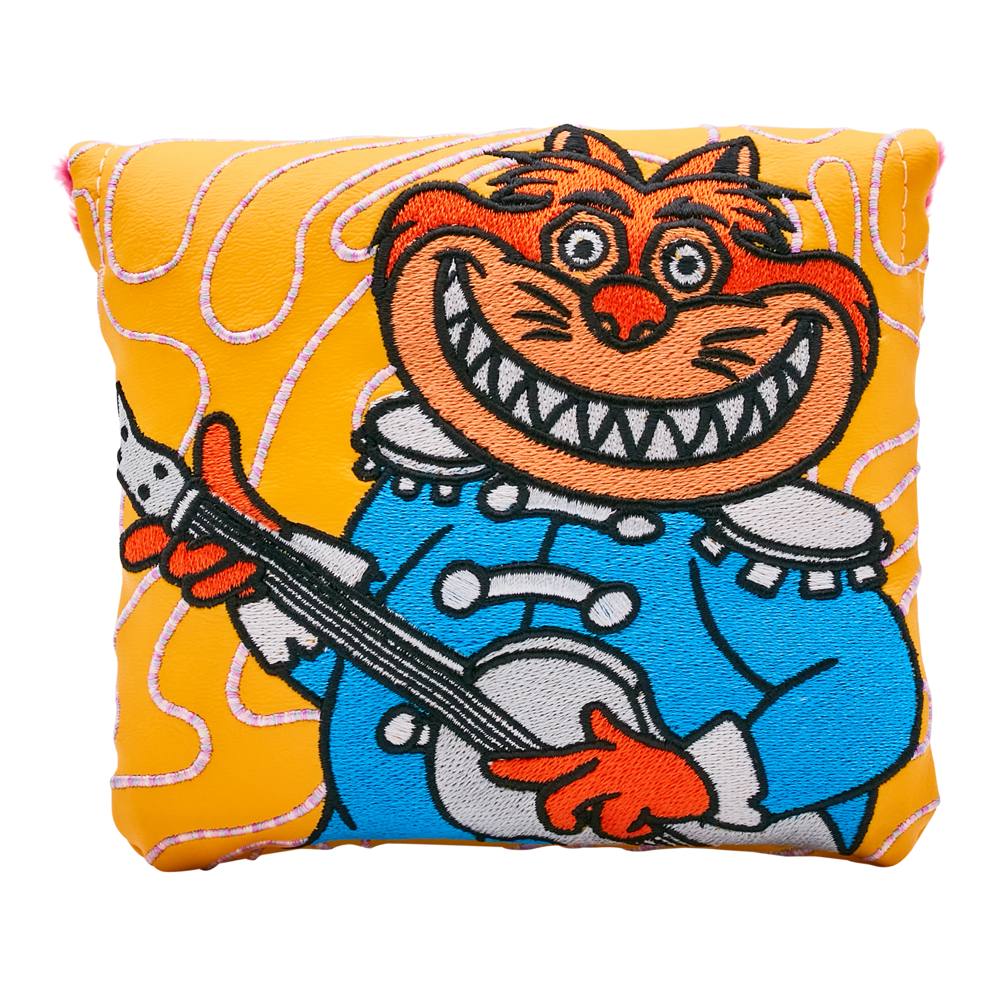This cat can shred! This mallet putter headcover features our Fat Cat wearing his travelling band attire and grooving on his bass guitar. Stitched on a yellow bass with a heathered coral lava pattern throughout, this headcover is finished with a pink plush interior for that extra pop. Limited quantities are available. Limit 1 per person. Good luck!
