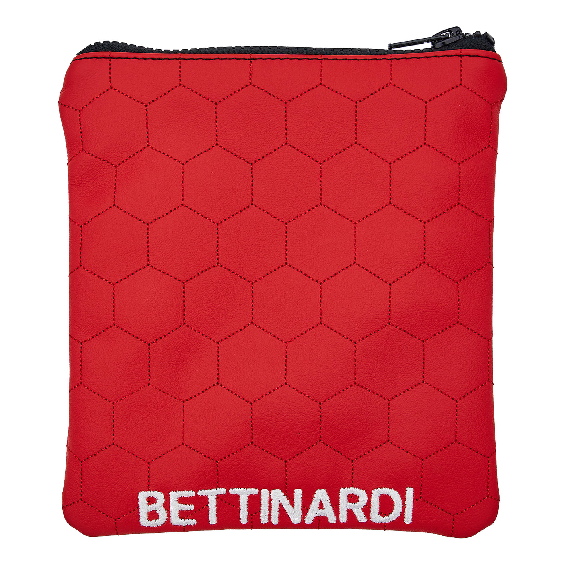 This red T-Hive valuables pouch is featured in a red vinyl with a stitched hexagonal pattern throughout. It includes an embroidered Bettinardi wordmark on the back. The pouch is lined with soft plush and includes a black zipper at the top. Keep all your belongings in one place with this classy pouch, made in Tinley Park, Illinois.