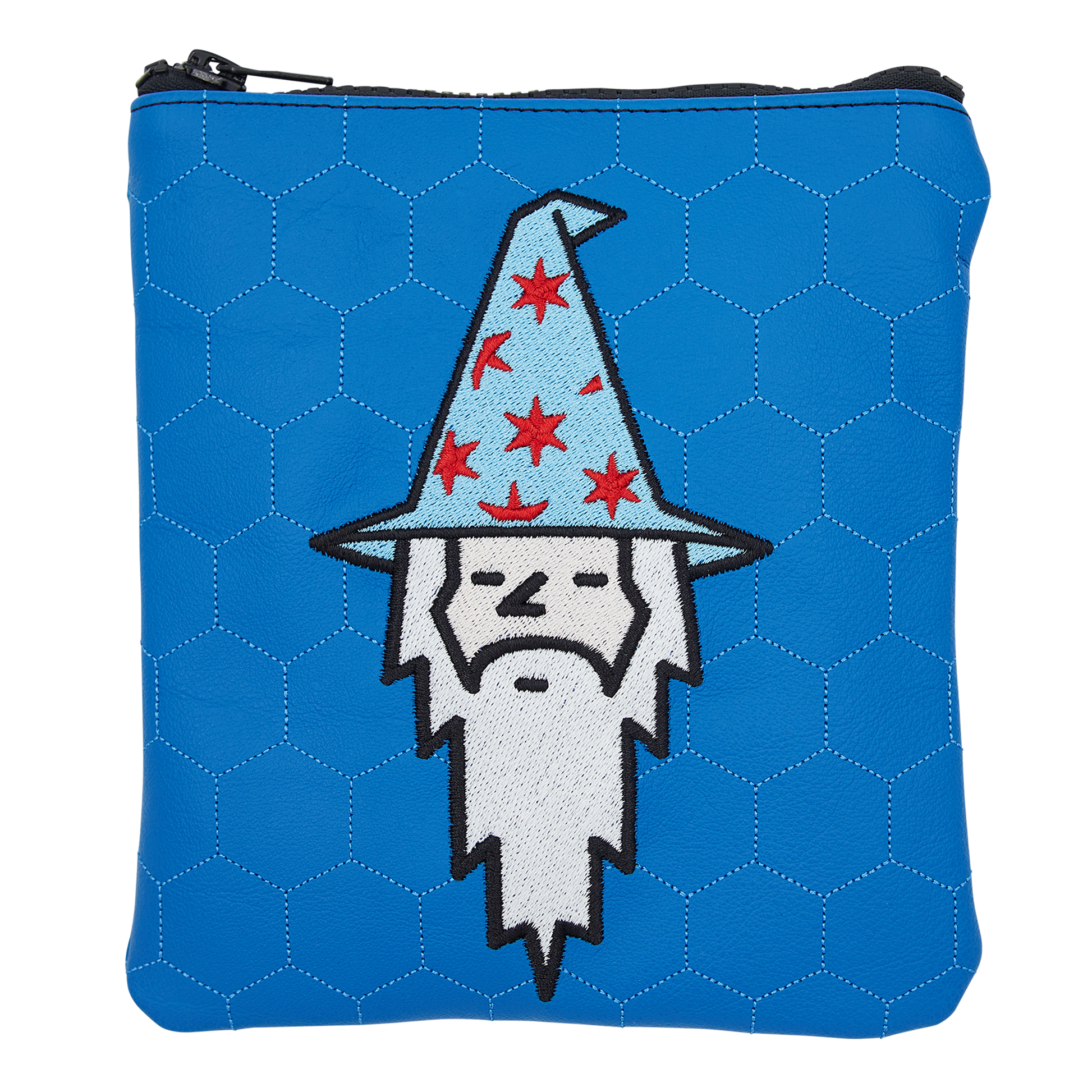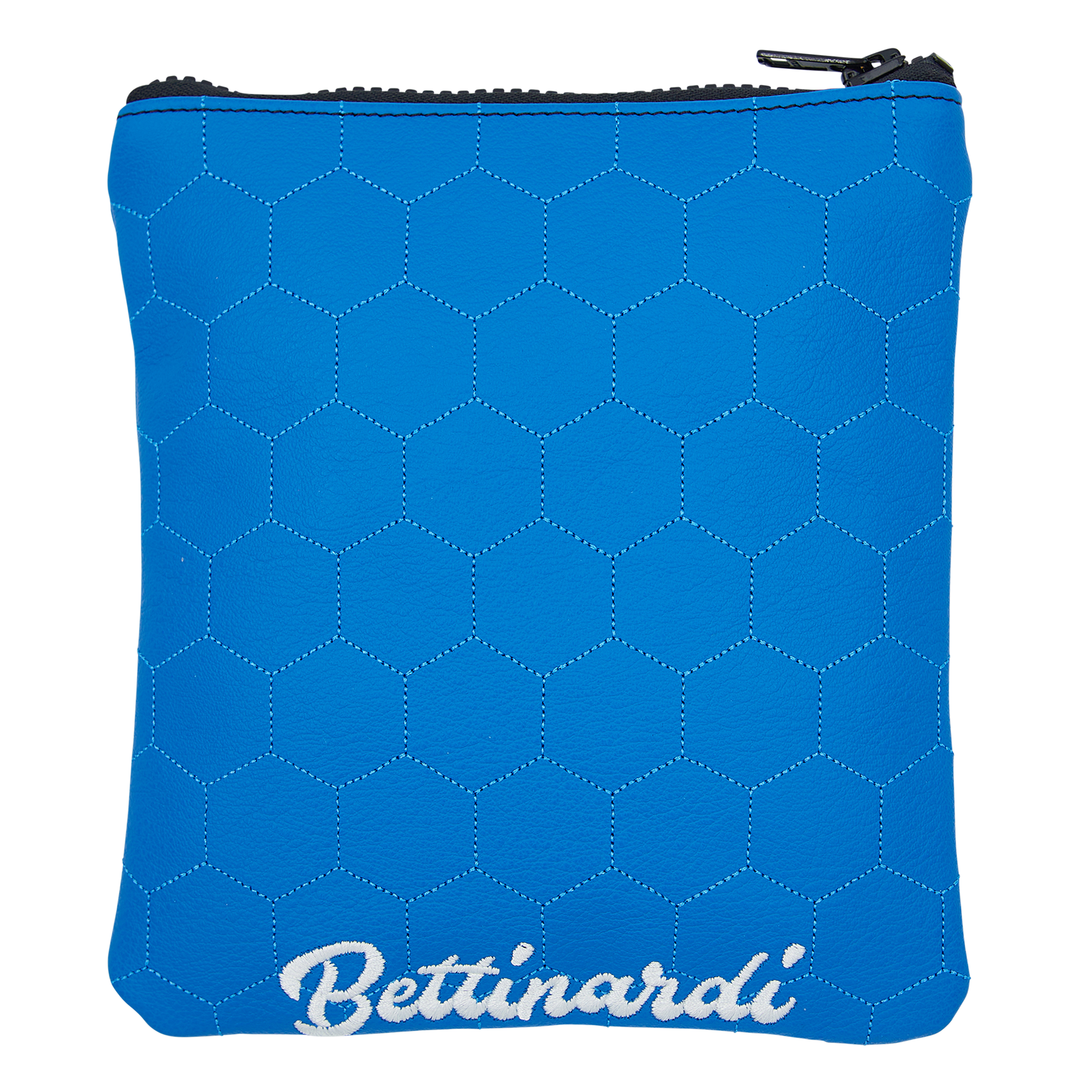 This Windy City Wizard valuables pouch is featured in a royal blue vinyl with a stitched hexagonal pattern throughout. It includes an embroidered Bettinardi script wordmark on the back. The pouch is lined with soft plush and includes a black zipper at the top. Keep all your belongings in one place with this classy pouch, made in Tinley Park, Illinois.